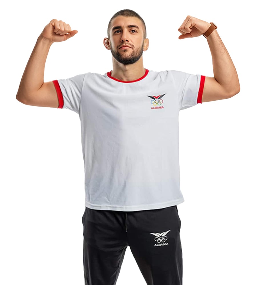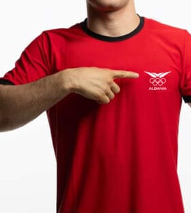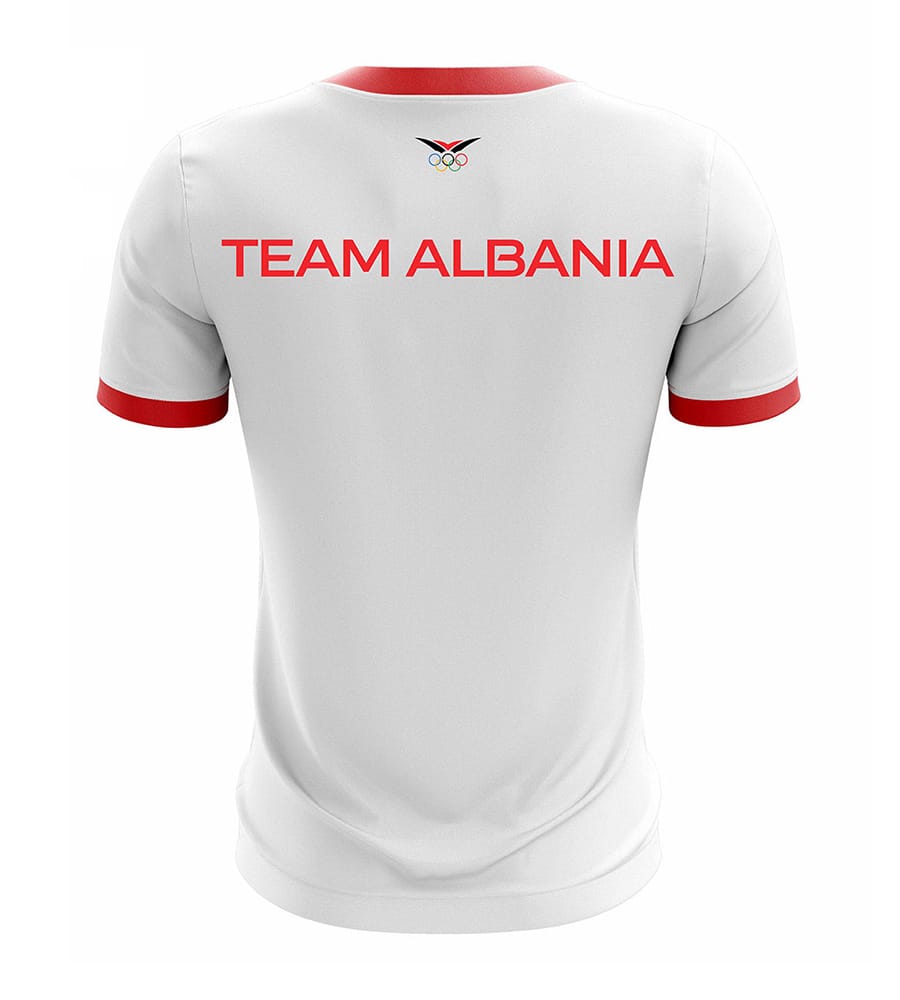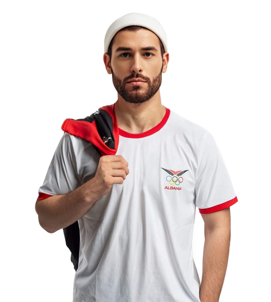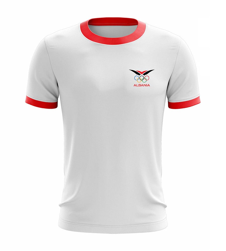 Material: It is made of high – quality cotton material to ensure the comfort and breathability of the T – shirt. The edges of the collar and cuffs are decorated with bright red stripes, adding a visual contrast. On the left chest of the T – shirt, there is an Olympic logo composed of five rings, in colors of black, red, blue, green, and yellow. These colors represent the five sports events of the Olympic Games. Below the logo is the word “ALBANIA” in black font, echoing the five – ring logo.