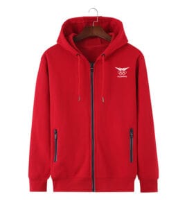 Color and Design: The main body is white, with red collar and cuffs, and black fonts.